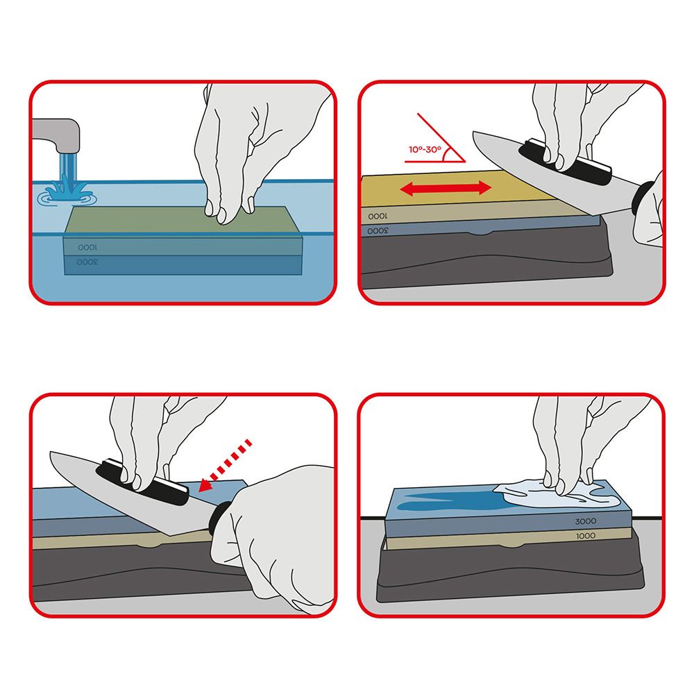 PIEDRA PARA AFILAR 1000/3000, INCLUYE BASE ANTIDESLIZANTE, DOS GUÍAS DE AFILADO PARA CUCHILLOS PEQUEÑOS Y GRANDES Y REPARADOR PARA LIMPIAR Y ALISAR LA PIEDRA. DIMENSIONES: 20 x 8 x 5,5 cm