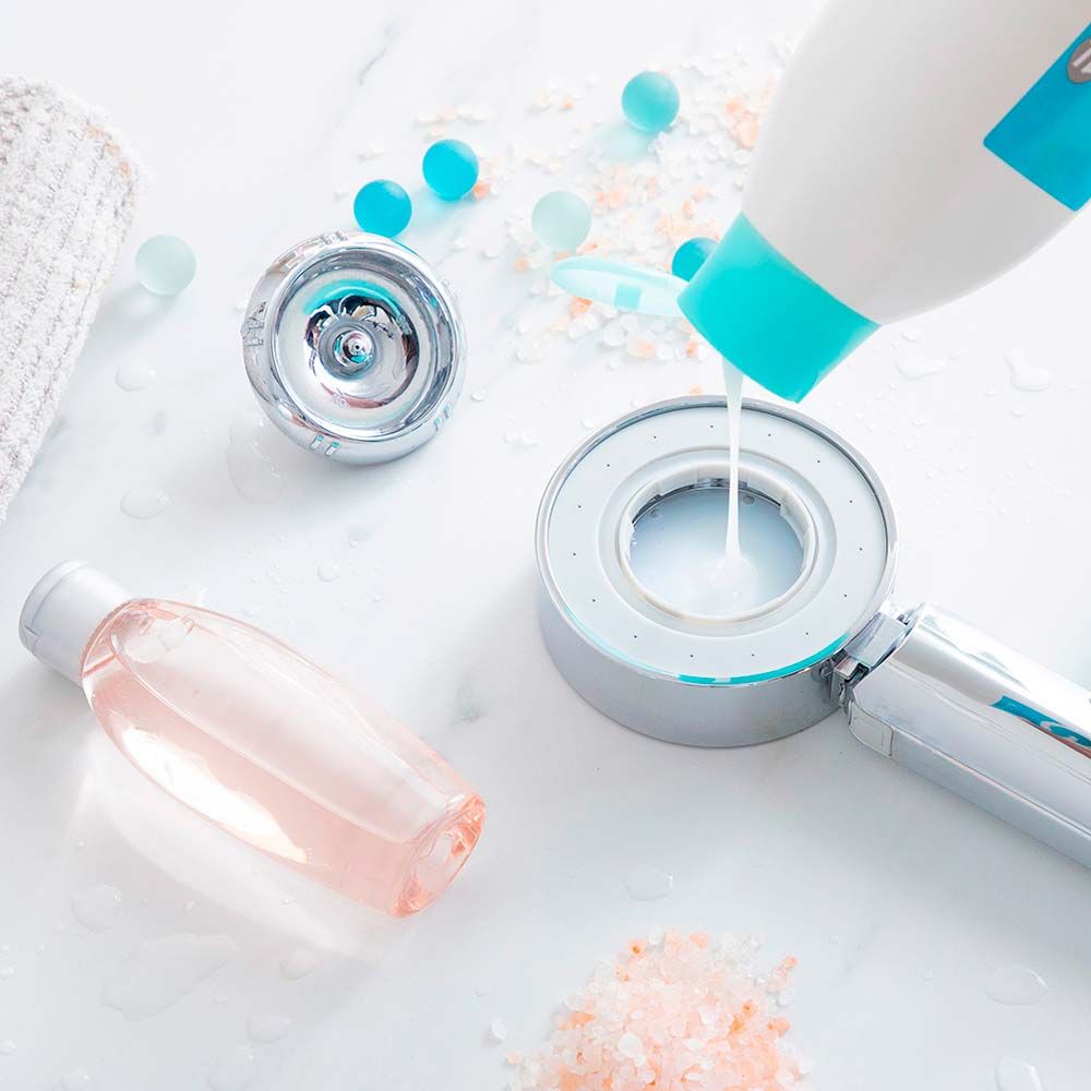 MANGO DE DUCHA DOBLE CON DISPENSADOR 3 EN 1 XAWARA. DISPONE DE DOS MODOS DE SALIDA DE AGUA: EFECTO LLUVIA Y PULVERIZADOR. CON DEPÓSITO PARA GEL, ACEITES ESENCIALES, SALES DE BAÑO, ETC