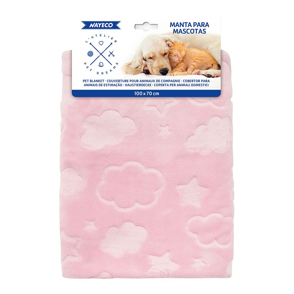 LA MANTA ROSA CON NUBES Y ESTRELLAS ES UNA CREACIÓN DISEÑADA PARA MIMAR A TUS QUERIDAS MASCOTAS. DIMENSIONES DE 100 x 70 cm. DECORADA CON ENCANTADORES DIBUJOS EN RELIEVE. TEXTURA SUAVE