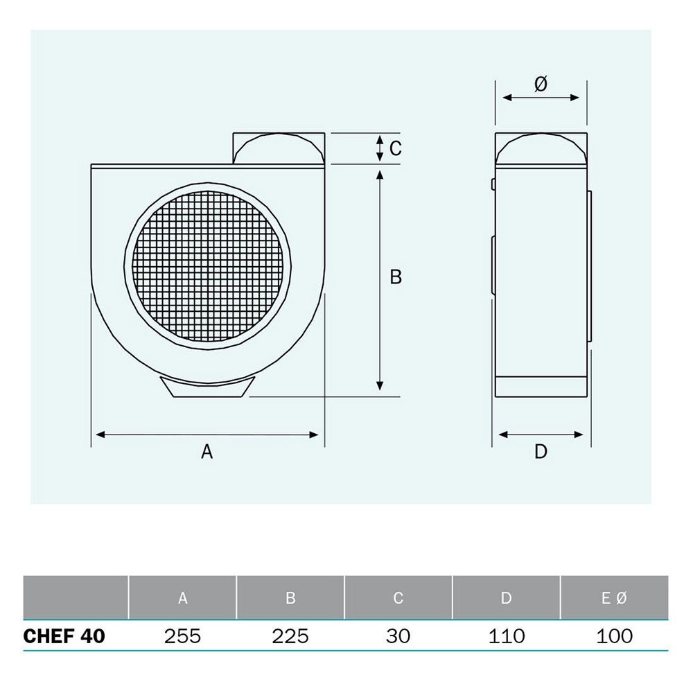 EXTRACTOR CENTRÍFUGO PARA CAMPANA DE COCINA, CHEF 40 - 60 W, 220-240 V~50-60 Hz, 1400 rpm, 350 m³/h - CARCASA METÁLICA DE ALTA RESISTENCIA, FILTRO ANTIGRASA METÁLICO LAVABLE - CABLE CON TOMA SCHUKO - ADAPTADOR DE SALIDA PARA TUBO DE Ø100 mm - INCLUYE TORNILLERÍA - 25,5 × 30,4 × 13,5 cm