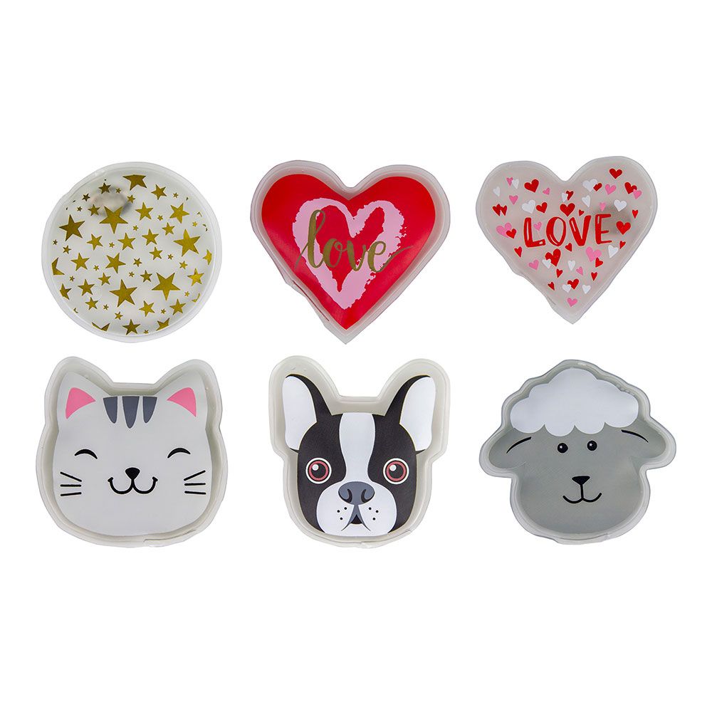 CALENTADOR DE MANOS REUTILIZABLE, MODELOS VARIADOS, DURACIÓN APROXIMADA 30 min, EL LÍQUIDO CRISTALIZA Y ALCANZA LOS 50-55 °C, DIMENSIONES 11 x 10 x 1 cm APROX., PRESENTADO EN EXPOSITOR DE 36 uds
