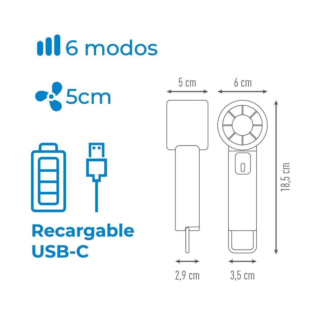 VENTILADOR DE MANO DIGITAL, 6 MODOS Y VELOCIDAD REGULABLE DE CERO A 199, CON PANTALLA DIGITAL, CON GANCHO - BASE PLEGABLE. RECARGABLE POR PUERTO USB-C DE 20 cm (INCLUIDO), BATERÍA 1200 mAh. TIEMPO DE CARGA 1,5 h, 7 h MÁXIMO DE AUTONOMÍA. DIMENSIONES ASPA DE Ø5 cm / 3,5 x 2,9 x 18,5 cm