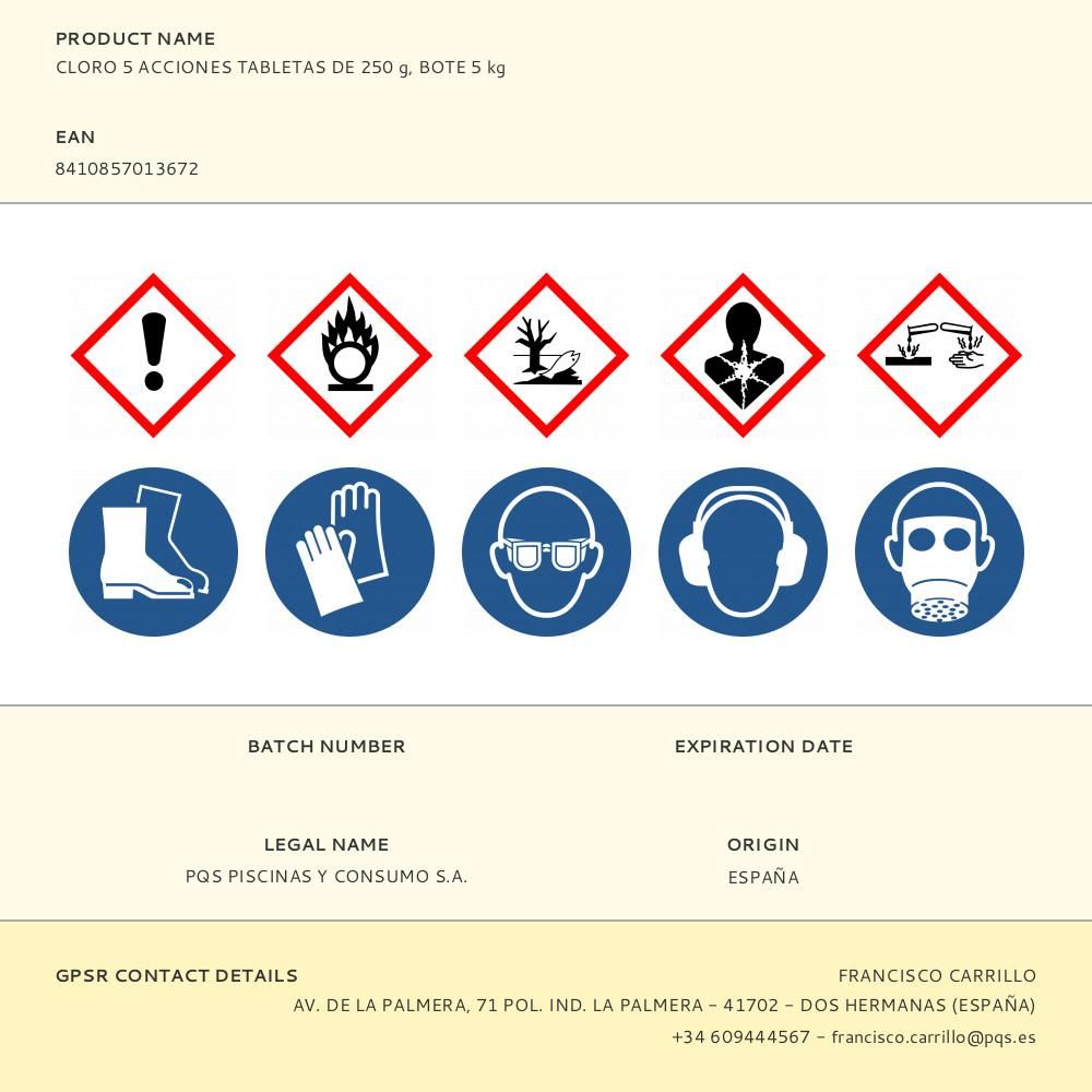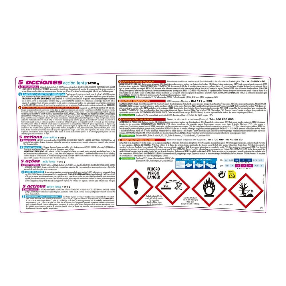 CLORO 5 ACCIONES, TABLETAS DE 250 g, BOTE 5 kg. DE DISOLUCIÓN LENTA CON 5 EFECTOS: DESINFECTANTE, ESTABILIZADOR DE CLORO, ALGICIDA, ANTIHONGOS Y FLOCULANTE. DOSIS: AÑADIR 2 TABLETAS A LA SEMANA EN SKIMMER O CLORADOR FLOTANTE POR CADA 60 m³ DE AGUA