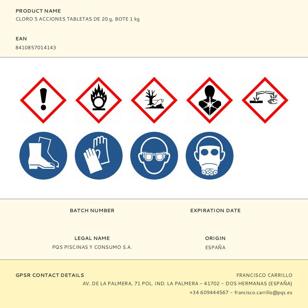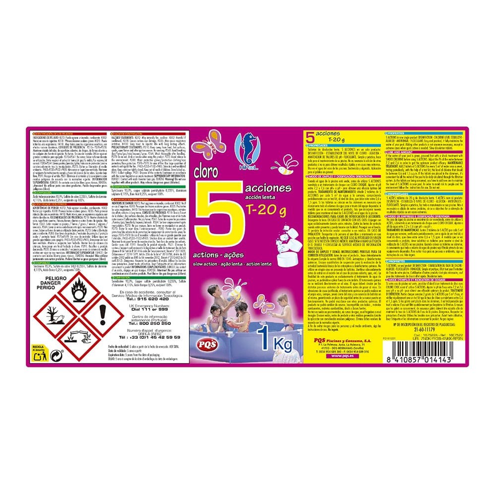 CLORO 5 ACCIONES, TABLETAS DE 20 g, BOTE 1 kg. DE DISOLUCIÓN LENTA CON 5 EFECTOS: DESINFECCIÓN, ALGICIDA, FLOCULANTE, ESTABILIZADOR DEL NIVEL DE CLORO Y MANTENEDOR DE VALORES DE pH. TRATAMIENTO: AÑADIR 2 TABLETAS A LA SEMANA POR CADA 5 m³ DE AGUA