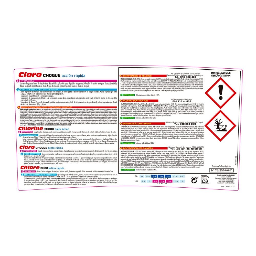 CLORO DE CHOQUE GRANULADO, BOTE 5 kg. BACTERICIDA DE ACCIÓN ENÉRGICA Y DISOLUCIÓN RÁPIDA PARA EL TRATAMIENTO DE AGUAS VERDES O TURBIAS. PROPORCIONA UN APORTE INSTANTÁNEO Y ESTABILIZADO DE CLORO EN EL VASO DE LA PISCINA. CONSULTAR LA ETIQUETA PARA MÁS INFORMACIÓN SOBRE DOSIS