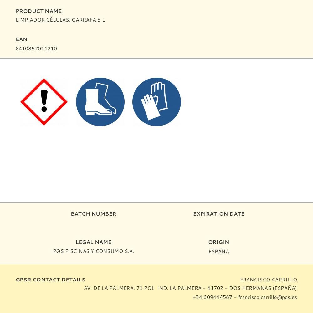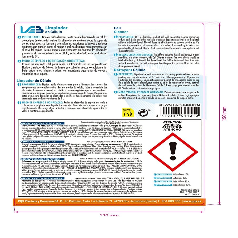 LIMPIADOR CÉLULAS, GARRAFA 5 l. LÍQUIDO ÁCIDO DESINCRUSTANTE PARA LA LIMPIEZA DE LAS CÉLULAS DE EQUIPOS DE ELECTRÓLISIS SALINA. PARA ELIMINAR LAS INCRUSTACIONES CALCÁREAS Y RESIDUOS ORGÁNICOS QUE SE FORMAN Y ACUMULAN EN EL INTERIOR