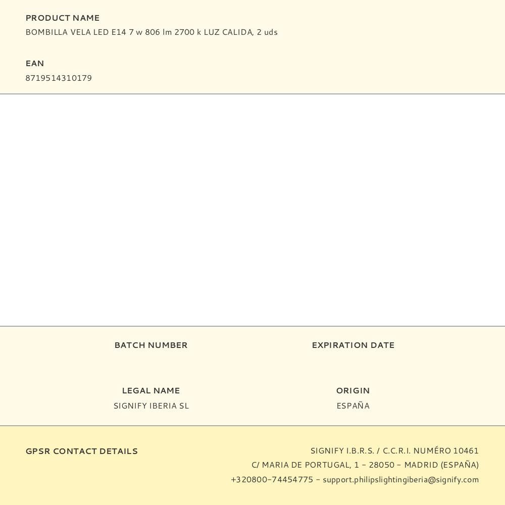 BOMBILLA VELA LED E14 - 7 W EQUIVALENCIA 60 W - 806 lm - 2700 K - LUZ CÁLIDA - CRI 80 - CLASIFICACIÓN ENERGÉTICA E - VIDA ÚTIL: 15.000 h - 220 - 240 V ~ 50/60 Hz - FLUJO LUMINOSO 360°, NO REGULABLE - DIMENSIONES: 3,8 x 3,8 x 11,4 cm - 2 uds