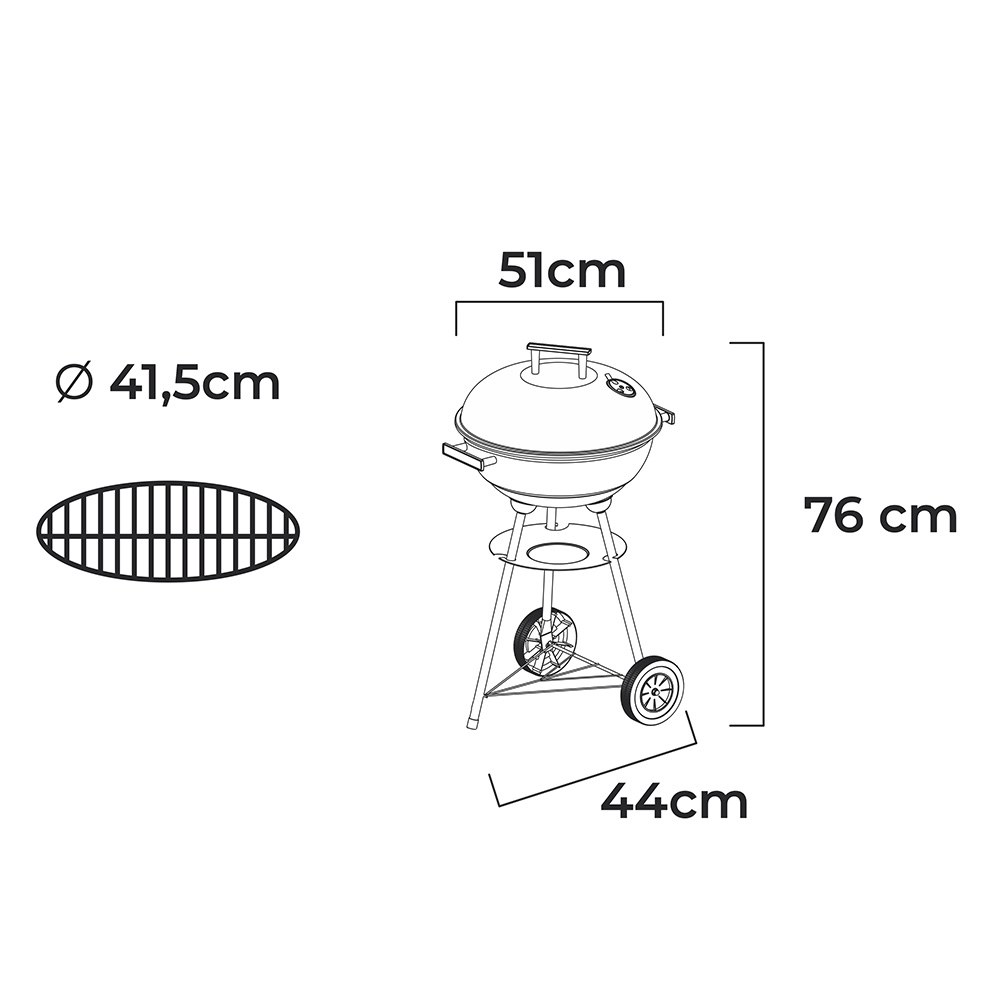 BARBACOA DE CARBÓN CON 3 PATAS, TAPA CON ASA Y 2 RUEDAS, METÁLICA DE ACERO CROMADO, NEGRA, CONTIENE: PARRILLA DE COCINADO Ø41,5 cm, CUENCO DE QUEMADO Ø43 cm, REJILLA DE CARBÓN Ø32 cm, BANDEJA DE CENIZAS Ø29 cm, 2 RUEDAS DE Ø14,5 cm, Y ELEMENTOS DE FIJACIÓN - DIMENSIONES TOTALES: Ø51 x 76 cm