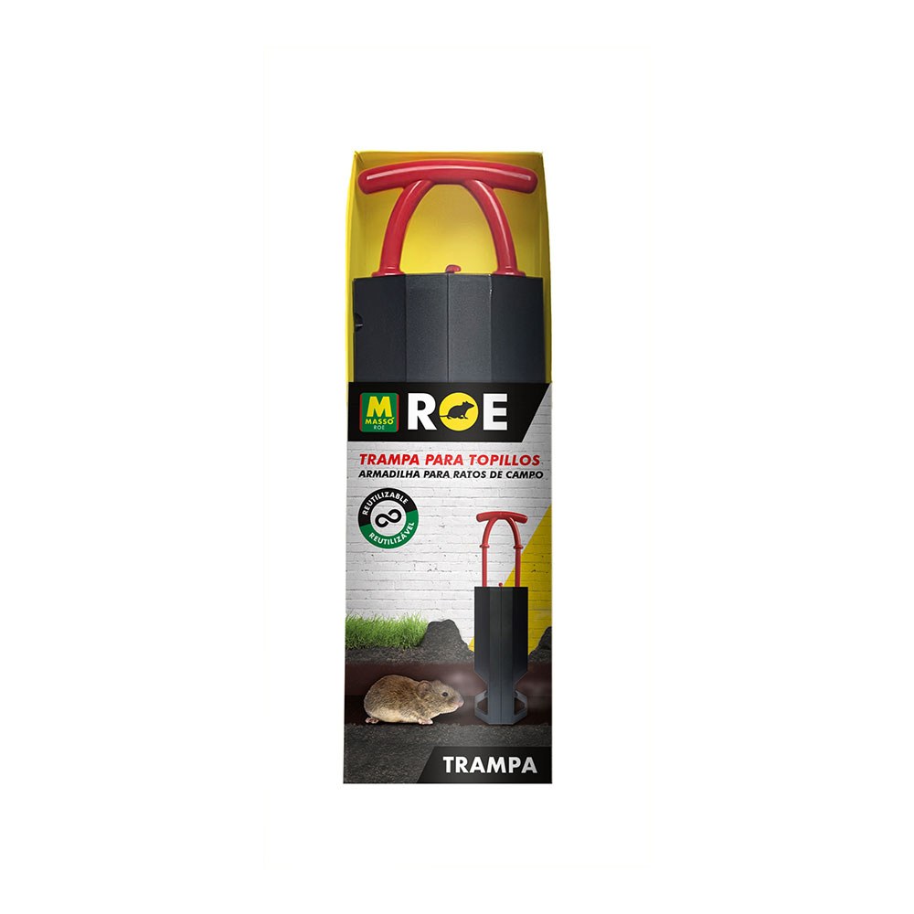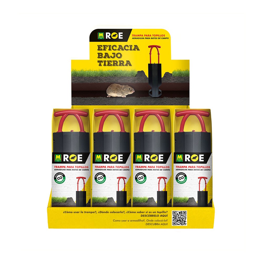 TRAMPA MECÁNICA PARA RATONES DE JARDÍN, TOPILLOS Y RATONES DE CAMPO. SIMPLE DE USAR, NO REQUIERE FUERZA. PARA USO EN JARDINES, PRADOS, CAMPOS Y HUERTOS. SE VE FÁCILMENTE CUANDO HA ATRAPADO UN ROEDOR. REUTILIZABLE. PRESENTADO EN EXPOSITOR DE 12 uds