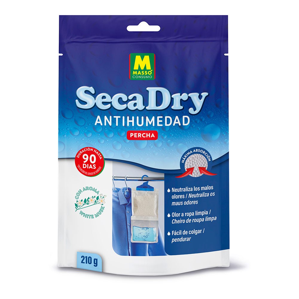PERCHA ANTIHUMEDAD SECADRY, 210 g, EN GRÁNULOS. REGULA EL EXCESO DE HUMEDAD EN EL AMBIENTE, ABSORBIÉNDOLO EN FORMA DE LÍQUIDO, QUE SE RECOGE EN SU BOLSA INFERIOR. PREVIENE LAS CONSECUENCIAS NEGATIVAS DEL EXCESO DE HUMEDAD EN LA ROPA. NEUTRALIZA LOS MALOS OLORES SIN IMPREGNAR CON SU AROMA WHITE MUSK