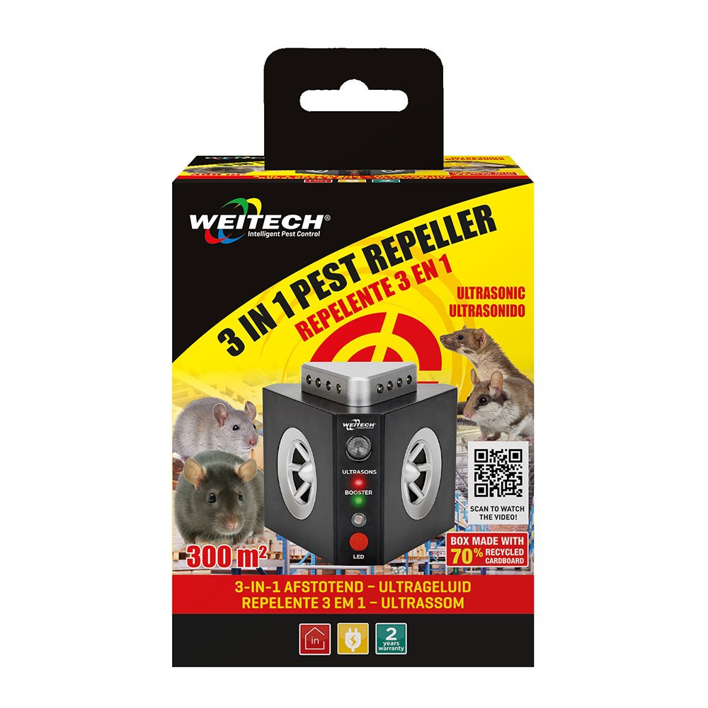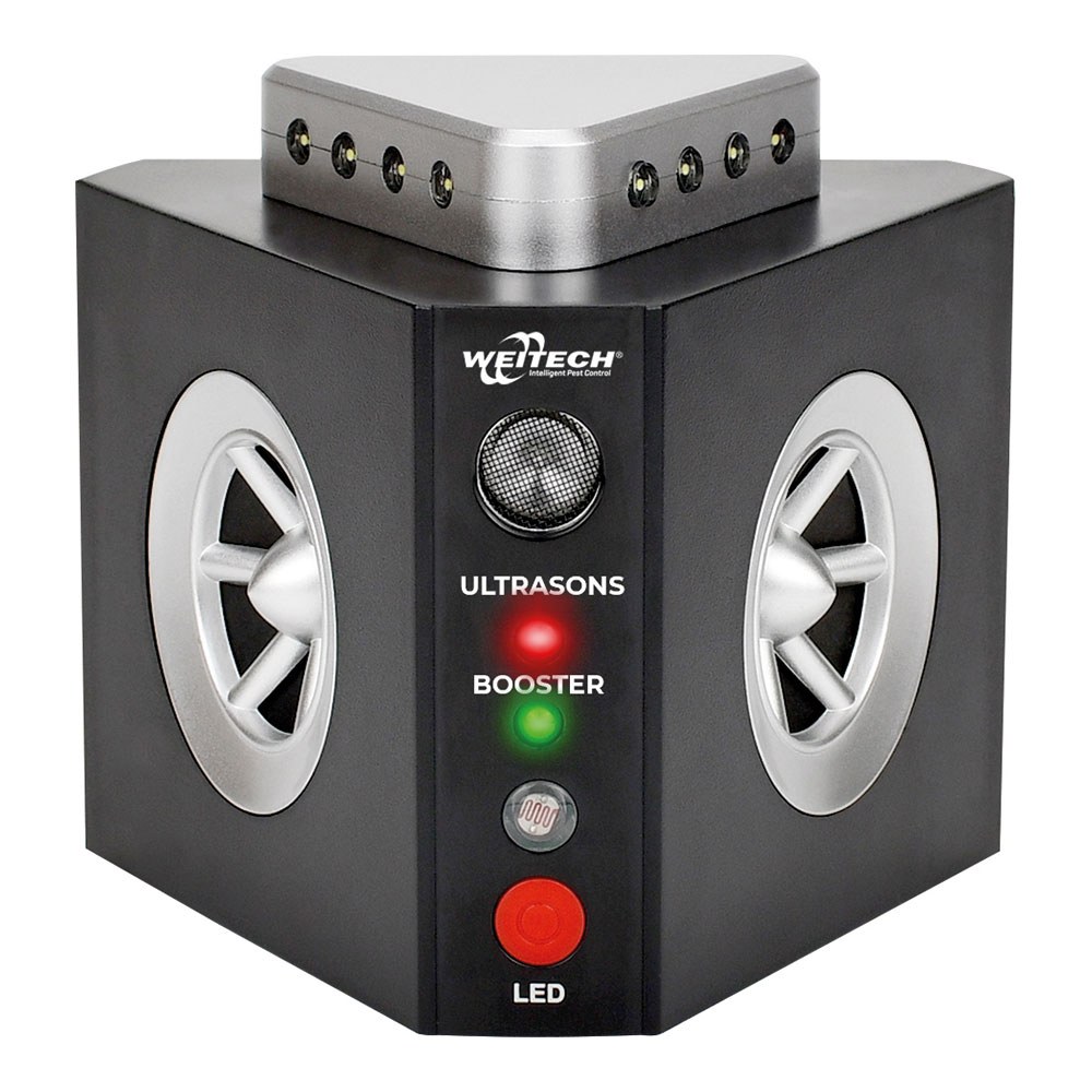 REPELENTE ULTRASÓNICO 3 EN 1 PARA ROEDORES. COBERTURA HASTA 300 m² EN INTERIORES. INCLUYE 2 ALTAVOCES DE 240°, AMPLIFICADOR DE FRECUENCIA Y SISTEMA FLASH 360° CON 12 LEDS Y SENSOR DE LUMINOSIDAD. TENSIÓN: 220 - 240 V ~50/60 Hz. DIMENSIONES: 11 x 9,5 x 9,5 cm