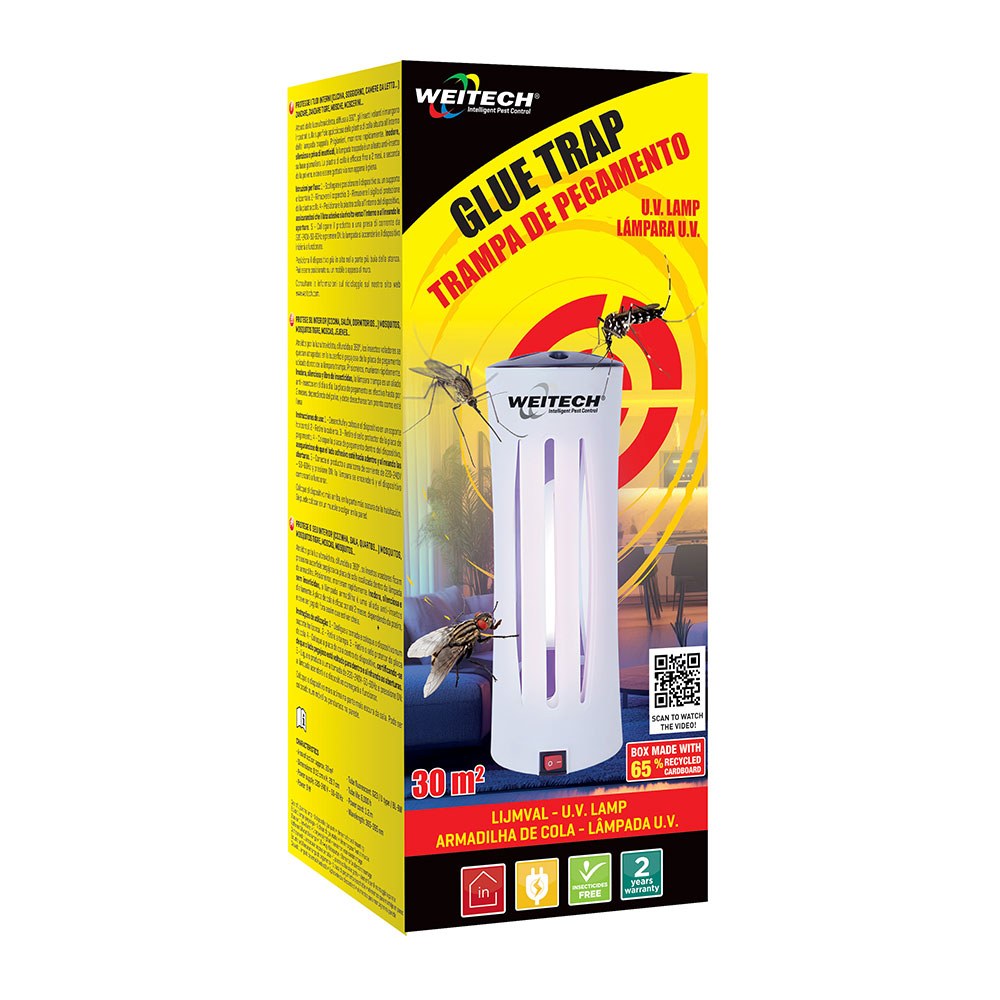 ATRAPA INSECTOS VOLADORES CON LUZ UV Y TRAMPA ADHESIVA. ALCANCE: 30 m². 9 W, TENSIÓN 220-240 V ~ 50-60 Hz. TUBO FLUORESCENTE BLANCO G23/TIPO U - VIDA ÚTIL FLUORESCENTE 6.000 h - CABLE DE 1,2 m. LONGITUD DE ONDA: 365 - 395 nm. ATRAE AL INSECTO CON LA LUZ UV DIFUNDIDA A 360° Y SE QUEDA ENGANCHADO EN LA TRAMPA DE PEGAMENTO. INODORA, SILENCIOSA Y LIBRE DE INSECTICIDAS. CONTENIDO: ESTUCHE DE UNA LÁMPARA TRAMPA DE PEGAMENTO + 1 PLACA DE PEGAMENTO DESECHABLE Y ELEMENTOS PARA MONTAJE EN PARED. DIMENSIONES: Ø12 x 29,7 cm